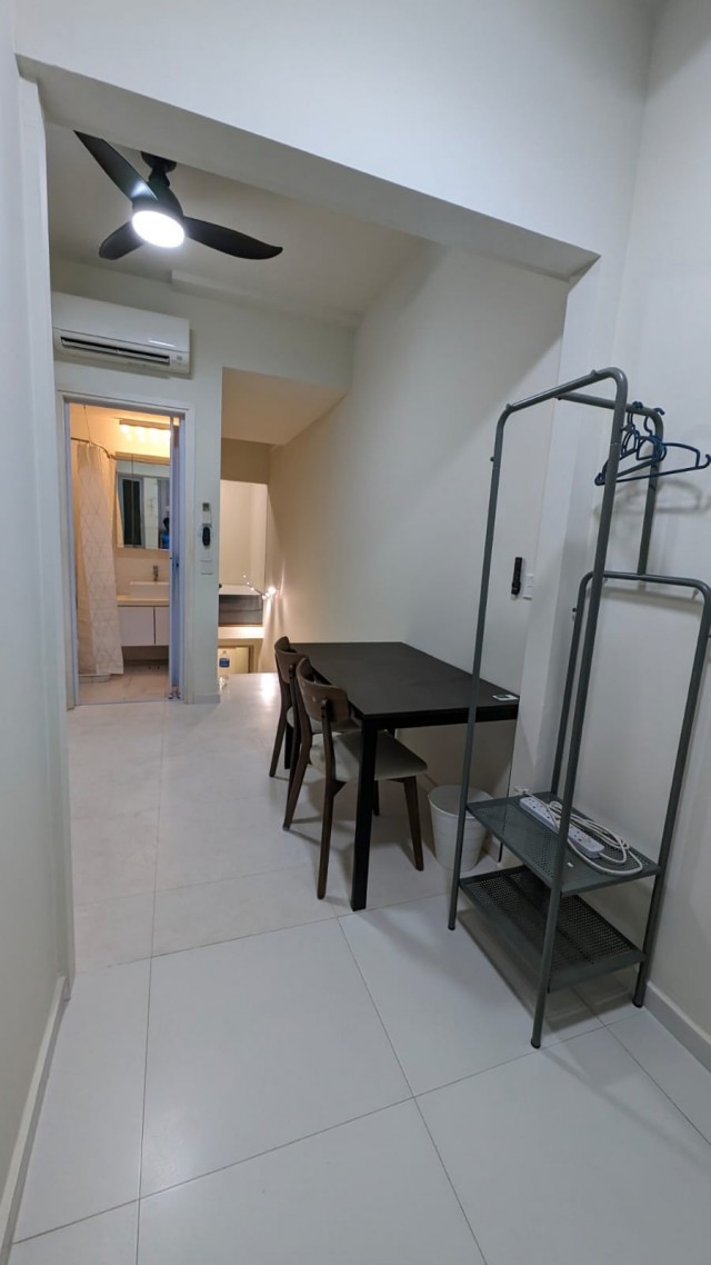 This thoughtfully designed 1-bedroom unit features wood-look flooring, a cozy queen-sized bed, and a wall-mounted TV, ensuring comfort and convenience. The bathroom is tastefully finished with tiled walls and a vanity mirror, while the dining area is equipped with a dining table and ceiling fan, enhancing the overall living experience. Enjoy the ease of integrated appliances, including an induction hob and washing machine, tailored for modern living.