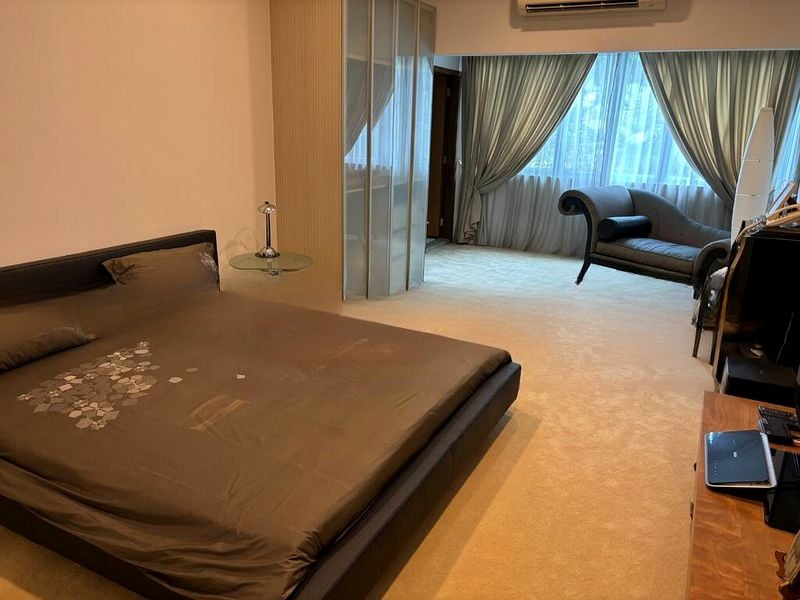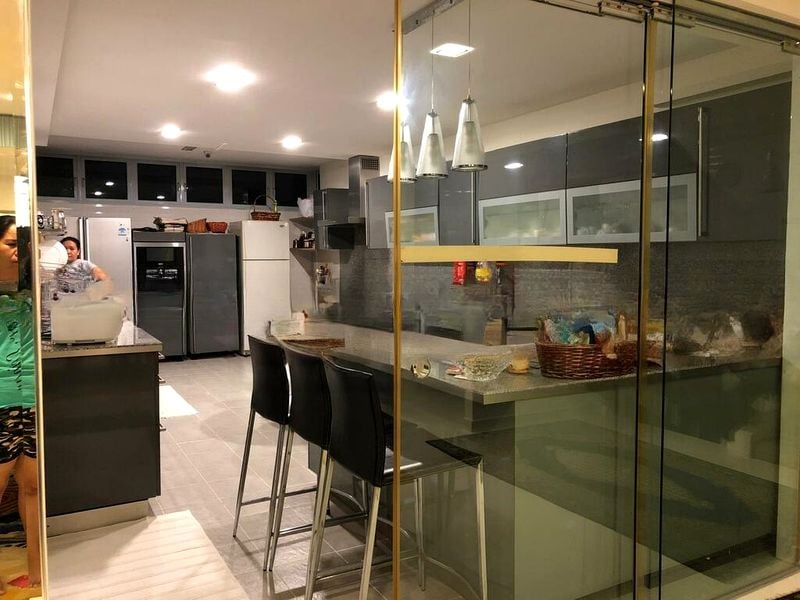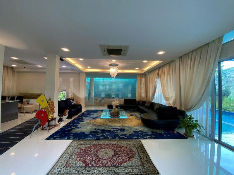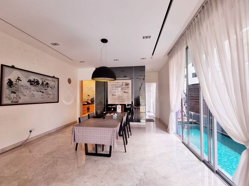 Step into a world of elegance as you enter this stunning 7-bedroom home at Kim Lin Park. The bright and airy ambiance is accentuated by abundant natural light pouring through floor-to-ceiling glass doors, offering captivating views of the private lap pool and lush greenery. The marble flooring in the living areas adds a touch of sophistication, while the designer pendant lights in the dining room create an inviting atmosphere.