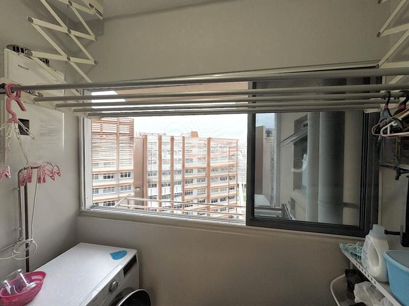 This well-maintained unit features an open-concept layout, seamlessly connecting the living and dining spaces. The dining area boasts a chic 6-seater dark wood dining set, complemented by a striking triple pendant light fixture. The study is a dream for productivity, equipped with built-in floor-to-ceiling shelving and an integrated L-shaped desk, all bathed in natural light. The foyer is accentuated by a stylish wooden slat partition and a convenient built-in shoe cabinet.