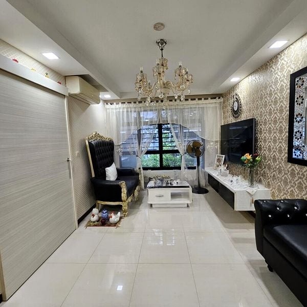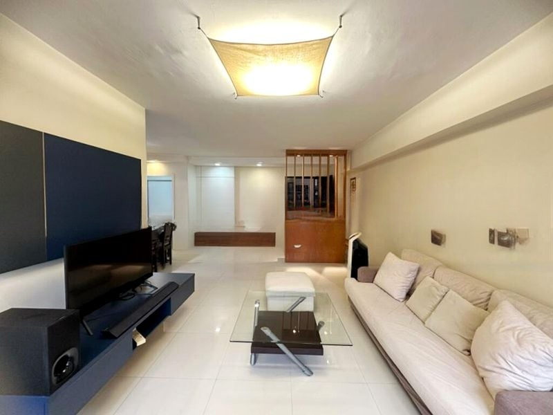 Step into this beautifully renovated 2-bedroom flat, where modern elegance meets functionality. The living room greets you with its raised platform area by the window, allowing natural light to flood through the floor-to-ceiling windows. Polished tile flooring and designer pendant lighting enhance the contemporary ambiance, while a large wall mirror in the dining area adds depth and sophistication.