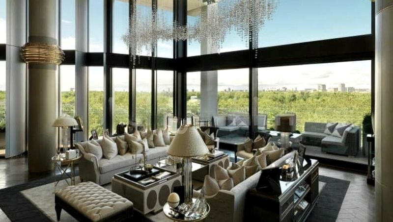 This exquisite unit boasts an impressive layout with five spacious bedrooms and four elegantly designed bathrooms. The dining room features a round glass-top table surrounded by designer upholstered chairs, complemented by a mirrored wall and recessed ceiling lighting. The living room, with its oversized chandelier and panoramic park views, is perfect for entertaining. Step outside to the balcony, where outdoor lounge furniture awaits, offering unobstructed views of the vibrant surroundings.