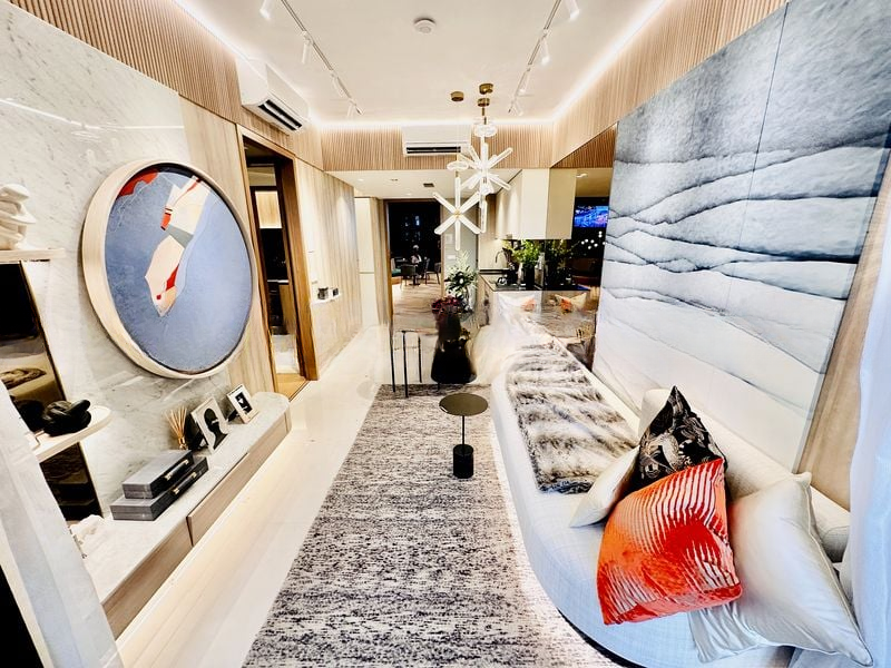 This thoughtfully designed 2-bedroom, 2-bathroom unit features standout elements such as a curved sofa in the living area, complemented by a textured area rug and a marble-look TV console. The integrated kitchen boasts high-end appliances, including an induction hob and stainless steel refrigerator, seamlessly blending style and functionality. The dining area, adorned with a designer pendant light, creates an inviting space for gatherings.