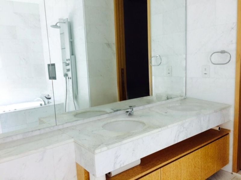 This spacious 4-bedroom, 3-bathroom layout features standout elements such as a luxurious white marble double vanity in the master bathroom, complemented by a rain shower and a relaxing bathtub. The open-concept living room boasts polished stone flooring, perfect for entertaining, while the galley kitchen is equipped with built-in appliances and sleek dual-tone cabinetry, catering to both style and functionality. Step out onto the balcony to soak in the serene pool view, enhancing your living experience.