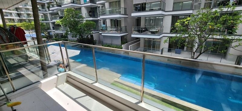 Step into a world of elegance as you enter this beautifully maintained unit at 8 @ Mount Sophia. The marble-look tiled flooring and recessed lighting create a warm ambiance, while the ornate crystal chandelier adds a touch of sophistication. The spacious entryway leads you to a large balcony, where you can enjoy serene views of lush greenery, perfect for unwinding after a long day.