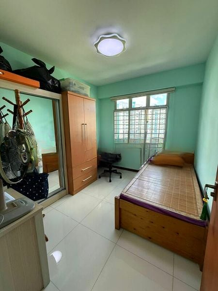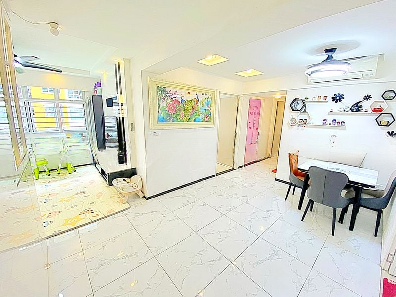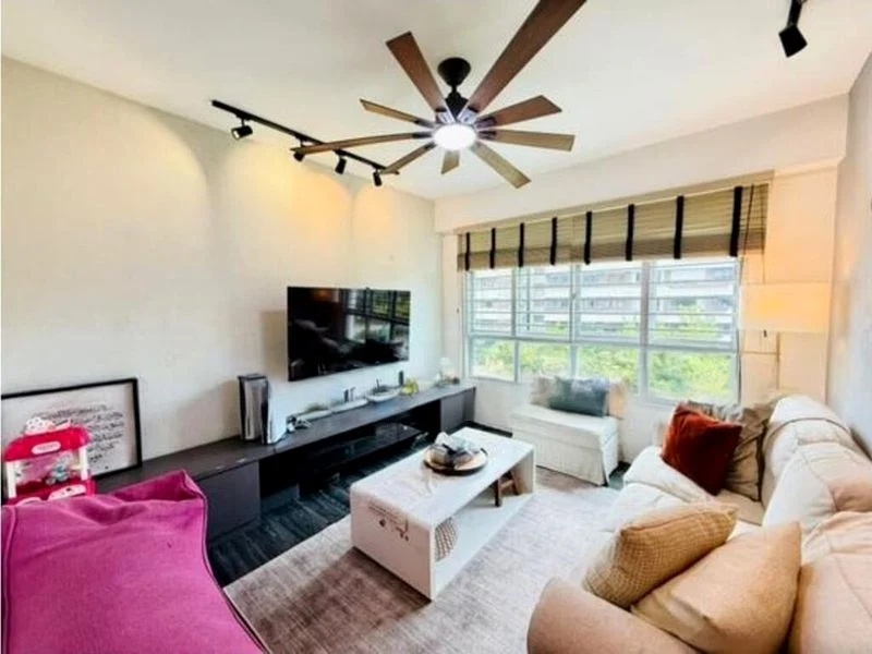Step into a warm and inviting atmosphere where natural light dances across the well-maintained interiors of this beautifully renovated 4-room flat. The cozy living room, adorned with track lighting and a large multi-blade ceiling fan, offers a serene view of lush greenery through expansive windows, creating a peaceful retreat from the hustle and bustle of city life.