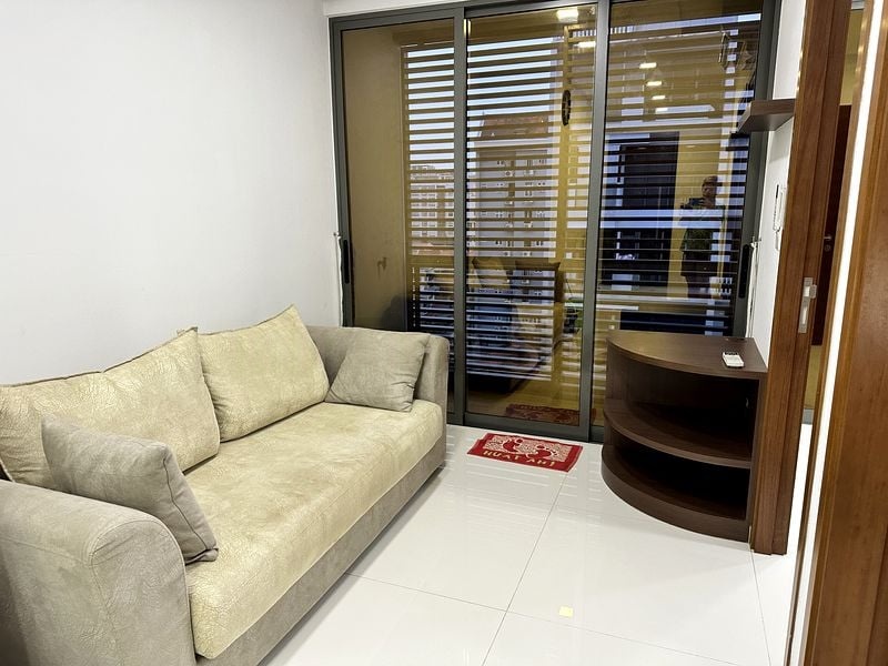 This thoughtfully designed unit features a compact kitchenette equipped with an integrated washing machine, making efficient use of space. The master bedroom boasts panoramic windows and a large mirrored wardrobe, while the bathroom is a sanctuary with a rain shower and integrated LED lighting. The additional study/bedroom offers versatility, complete with air conditioning and a sliding glass door that adds to the minimalist charm.