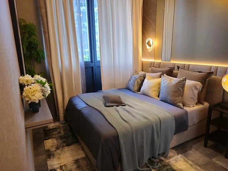 This thoughtfully designed 1-bedroom unit features a spacious bedroom with a built-in white wardrobe and integrated study desk, perfect for both relaxation and productivity. The bathroom is a luxurious retreat, boasting full marble-look wall and floor tiles, a walk-in shower with a rain shower feature, and a sleek wall-hung toilet. The kitchen is a chef's dream, equipped with black marble countertops, white cabinetry, and integrated appliances, ensuring both functionality and aesthetic appeal.