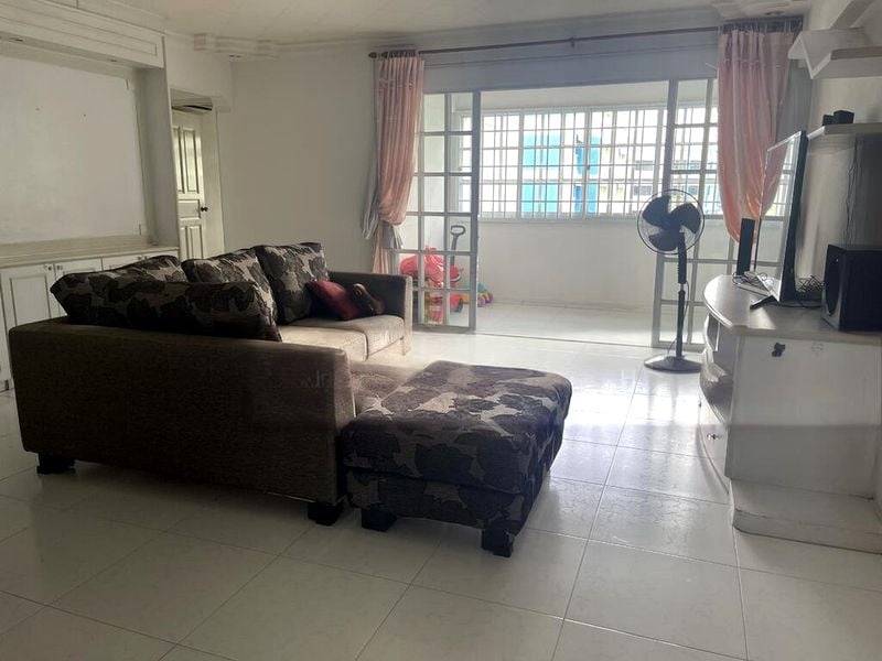 Step into this inviting 3-bedroom flat, where the charm of vintage finishes meets functional living. The moderate natural light filters through large windows, illuminating the spacious living room with tiled flooring and an L-shaped sofa, creating a warm and welcoming ambiance. The enclosed balcony offers a cozy spot to unwind, while the built-in display cabinets add a touch of character to the space.