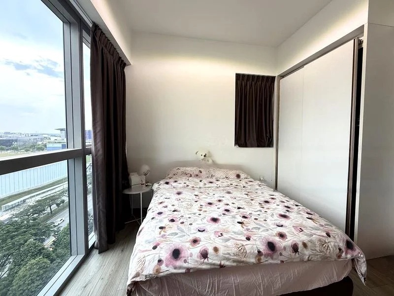 This efficient 1-bedroom + study layout spans 506 sqft and features a linear kitchen with integrated cabinetry and stainless steel appliances. The bedroom boasts a striking teal accent wall and a herringbone-patterned wooden headboard, while the versatile study area is adorned with extensive built-in storage, perfect for work or relaxation. The dual-access bathroom adds convenience, making this unit ideal for modern living.