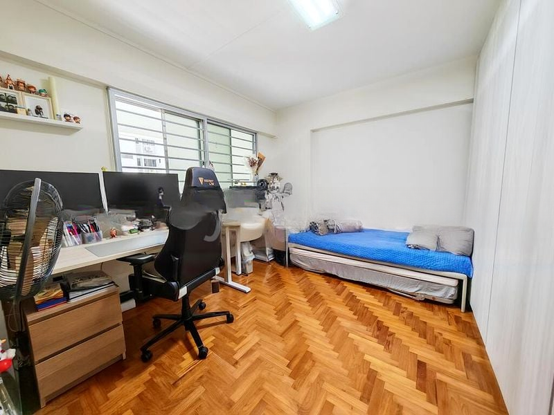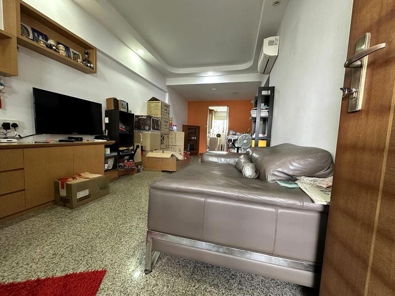 Step into this inviting 2-bedroom HDB flat and feel the warmth of home. The classic terrazzo flooring and recessed ceiling with cove lighting create a cozy ambiance, while the urban views from the living room offer a glimpse of community life. Natural light filters through, enhancing the lived-in charm of this well-maintained unit.