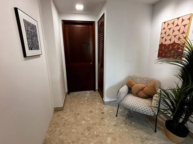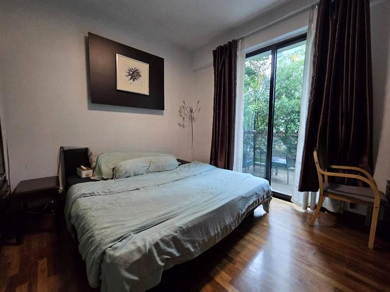 Step into a serene retreat where abundant natural light bathes the cozy living space, accentuating the warm wood flooring and inviting ambiance. Large sliding glass doors seamlessly connect the interior with a private patio, offering stunning views of lush greenery and an urban landscape. The soothing sound of the water feature adds to the tranquil atmosphere, making this unit a perfect escape from the hustle and bustle of city life.