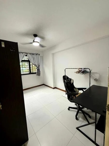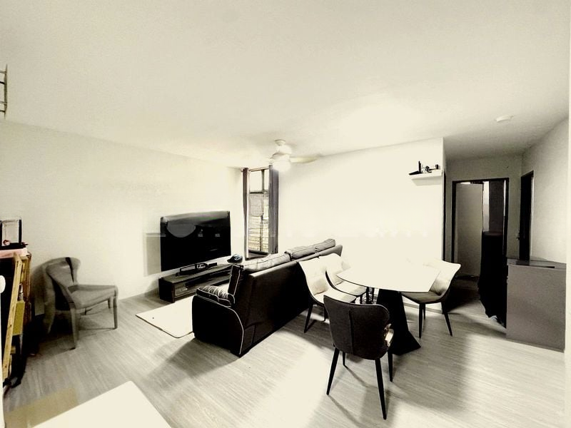 Step into a sanctuary of modern minimalist design at this beautifully renovated HDB flat. The open-concept living and dining area welcomes you with its consistent light wood-look flooring and an abundance of natural light filtering through, creating a warm and inviting ambiance. The scalloped edge area rug and industrial-style track lighting add character, while the Islamic calligraphy wall art offers a unique touch. Enjoy serene views of lush greenery from your windows, enhancing the tranquil atmosphere.