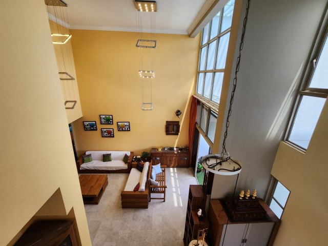 Step into a world of elegance as you enter this beautifully maintained unit at MODENA. The double-volume high ceiling and floor-to-ceiling windows bathe the living room in natural light, creating a cozy and warm ambiance. The marble flooring and striking orange accent wall, complemented by wooden sofa frames and wall-mounted artwork, invite you to relax and unwind while enjoying views of lush greenery and neighboring houses.