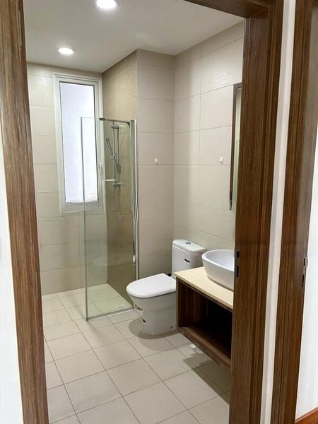This thoughtfully designed layout features a spacious living area that flows seamlessly into the kitchen, equipped with an L-shaped white countertop, a 3-burner gas stove, and a built-in oven. The master bedroom boasts a built-in floor-to-ceiling wardrobe, while the second bedroom is perfect for guests or as a study. The bathrooms are a highlight, featuring a luxurious rain shower and a stylish vessel sink with wood-grain vanity. A compact laundry area adds to the practicality of this home.