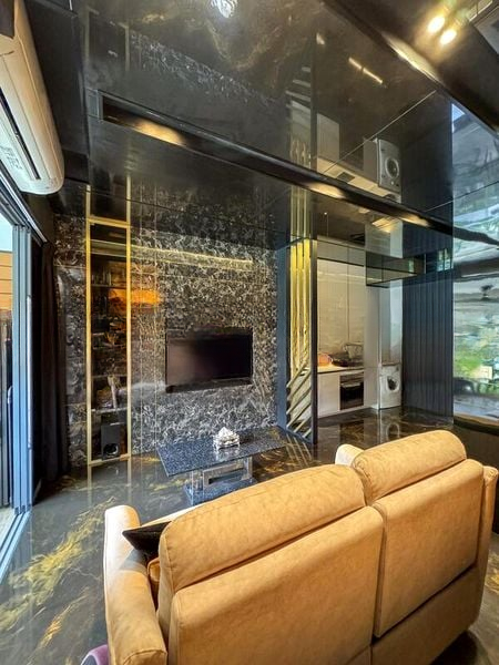 Step into a realm of modern luxury where designer finishes meet serene greenery views. The open-concept living area captivates with its dark marble feature wall and reflective ceilings, creating an ambiance that is both inviting and sophisticated. Natural light filters through large windows, enhancing the elegance of the marble flooring throughout the unit.