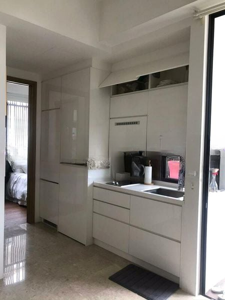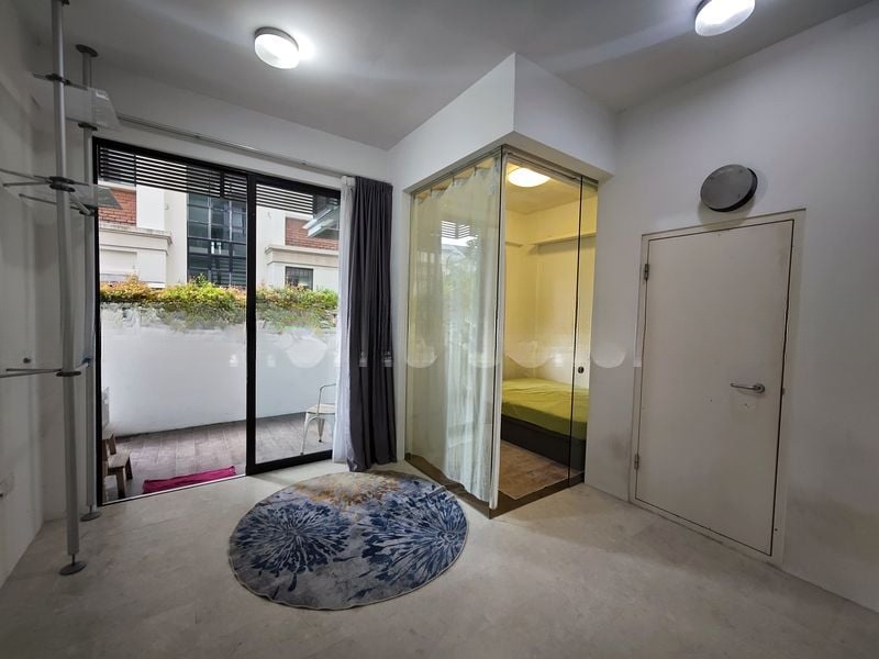 Step into a sanctuary of modern minimalist design, where natural light filters through glass-enclosed spaces, illuminating the sleek finishes and creating an inviting ambiance. The living area seamlessly flows into a private balcony adorned with a charming metal trellis, offering a perfect spot to unwind amidst greenery and neighboring views.