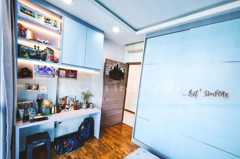 This well-maintained unit features a thoughtful layout with three bedrooms, including a master suite with a wood-paneled feature wall and direct balcony access. The second bedroom boasts a raised platform bed with integrated study space, while the third bedroom is equipped with built-in shelving and a study desk. Enjoy the luxury of a fully-furnished home with recessed ceiling lights and a stylish outdoor seating area on the timber-decked balcony.