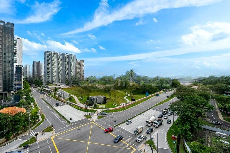 Step into a world of elegance and comfort in this beautifully renovated 1-bedroom unit at The Line @ Tanjong Rhu. The open-concept living area welcomes you with abundant natural light, highlighting the scalloped velvet sofa and the seamless integration of a study desk. Floor-to-ceiling windows frame stunning views of high-rise buildings, lush greenery, and even a distant sea view, creating a bright and airy ambiance that invites relaxation.