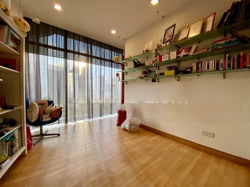 This spacious 3-bedroom layout features standout rooms including a master bedroom with recessed lighting and a study adorned with extensive wall-mounted shelving. The dining room, designed for both style and comfort, boasts modern acrylic furniture and a large wall mirror that enhances the sense of space. Each room is thoughtfully designed to maximize light and functionality, making it an ideal home for both relaxation and entertaining.