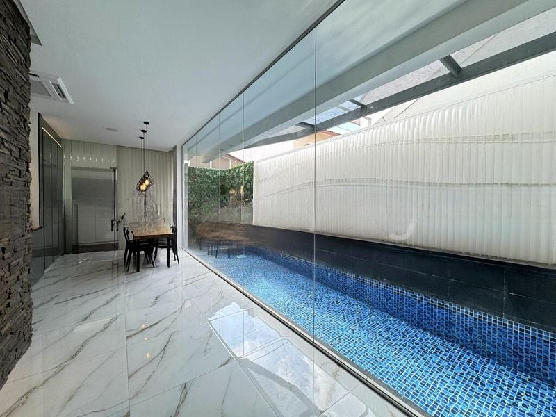 Step into a world of modern elegance as you enter this stunning designer home, where abundant natural light floods the open-concept living and dining area. The marble-look floor tiles and a striking stacked stone feature wall create a sophisticated ambiance, while floor-to-ceiling glass walls offer breathtaking views of the private lap pool and lush greenery, seamlessly blending indoor and outdoor living.
