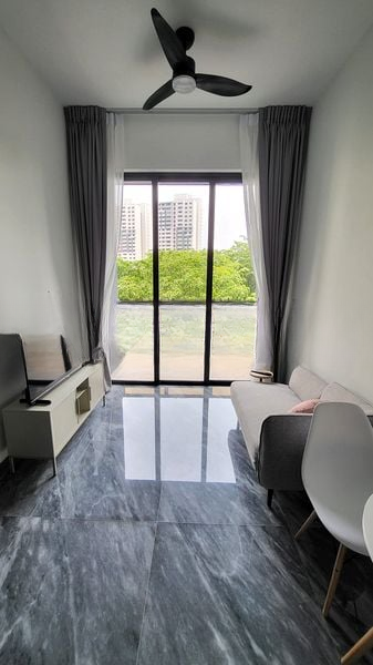 Step into a world of modern elegance as you enter this beautifully renovated unit at Sky Everton. The abundant natural light floods through the floor-to-ceiling sliding doors, illuminating the large format marble-look floor tiles that create a seamless flow between the living and dining areas. Enjoy breathtaking views of the city skyline and lush greenery from your glass-railed balcony, perfect for unwinding after a long day.