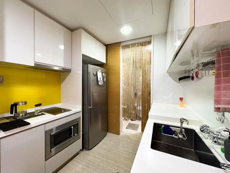 Step into a world of modern elegance as you enter this beautifully maintained 1-bedroom unit at MY MANHATTAN. The abundant natural light floods through the floor-to-ceiling windows, highlighting the polished floor tiles and sleek built-in cabinetry. Relax in the spacious living room, where a massage chair invites you to unwind while enjoying serene views of the pool and lush greenery outside.