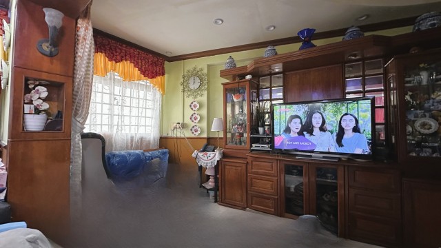 Step into a world of modern elegance as you enter this beautifully renovated HDB flat. The spacious living area greets you with large format floor tiles and a striking mirrored wall that reflects natural light, creating an inviting ambiance. A designer chandelier hangs gracefully above, enhancing the minimalist aesthetic while offering views of the surrounding residential landscape.