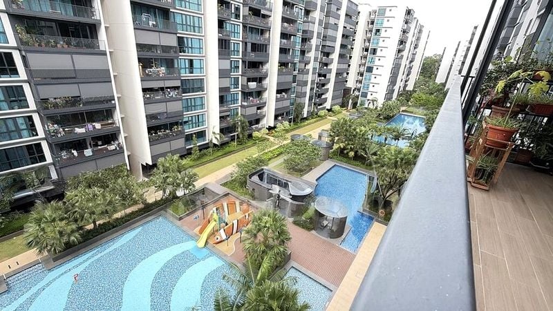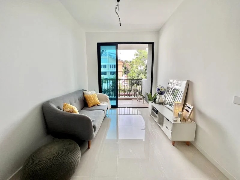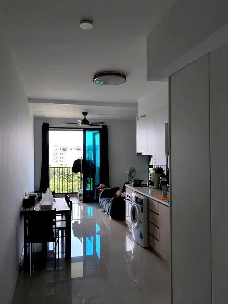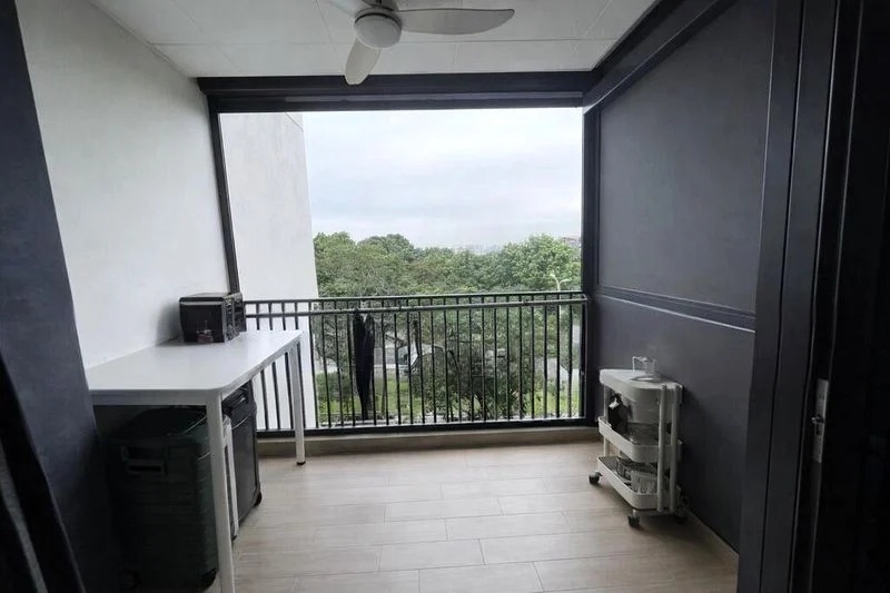 Step into a world of modern elegance as you enter this beautifully renovated unit at Treasure at Tampines. The airy ambiance is accentuated by natural light filtering through full-length curtains, highlighting the sleek marble-top dining and coffee tables that invite both comfort and style. The lush greenery view from the balcony creates a serene backdrop, perfect for relaxation.