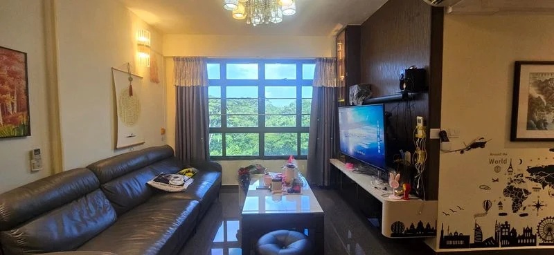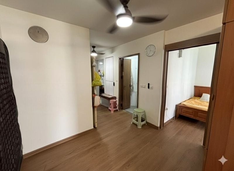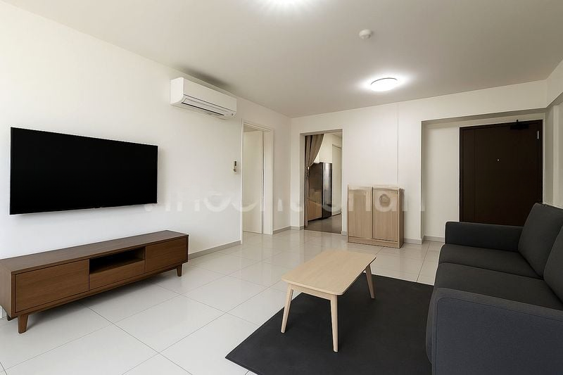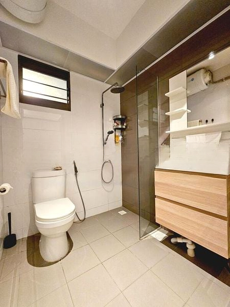 Step into this beautifully renovated HDB flat and feel the modern minimalist ambiance envelop you. Abundant natural light floods through large windows, illuminating the herringbone wood-look flooring and highlighting the elegant finishes throughout. The open-concept living area, adorned with a false ceiling featuring cove lighting, creates a warm and inviting space perfect for relaxation or entertaining.