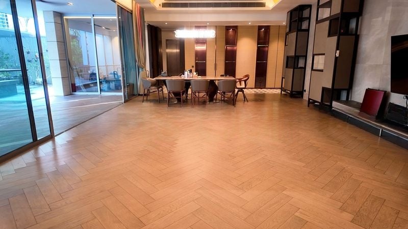 Step into a realm of modern luxury as you enter this exquisite unit at Nassim Park Residences. Bathed in abundant natural light, the open-concept living and dining area features stunning herringbone wood flooring and sliding glass doors that lead to a private balcony, offering serene views of lush greenery and neighboring residences. The designer finishes, including black marble with gold veining, create an ambiance of sophistication that is both inviting and elegant.