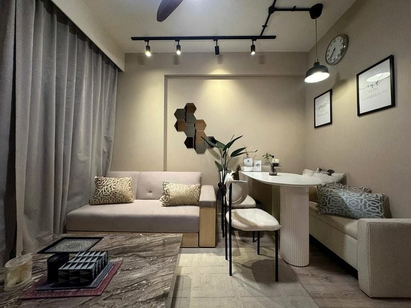 Step into this beautifully designed HDB unit where warmth and style greet you at every corner. The cozy living room, bathed in soft lighting, features a stunning marble-topped coffee table and a chic hexagonal wall mirror, creating an inviting atmosphere that feels like home. The compact dining nook, adorned with a coffee-themed wall decal, adds a touch of personality while maximizing space.