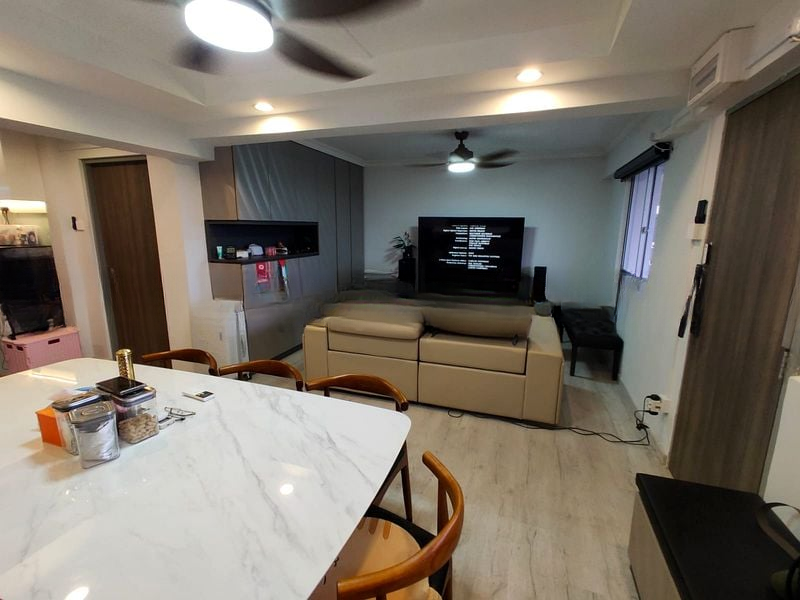 Step into this beautifully renovated 2-bedroom flat and be greeted by an ambiance of modern minimalism. The open-concept living area, bathed in natural light, features recessed lighting and a large wall-mounted TV, creating a perfect space for relaxation. Enjoy unblocked views of lush greenery from your living room, enhancing the tranquil atmosphere of your home.