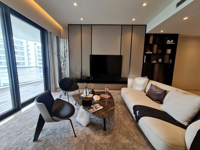 This well-maintained 3-bedroom unit boasts a spacious layout with standout features such as a marble-clad master bathroom complete with a luxurious bathtub and rain shower. The living area, adorned with a marble coffee table and built-in display shelving, seamlessly flows into the dining space, perfect for entertaining. Each bedroom offers unique views, with the master bedroom providing direct balcony access to enjoy the serene surroundings.