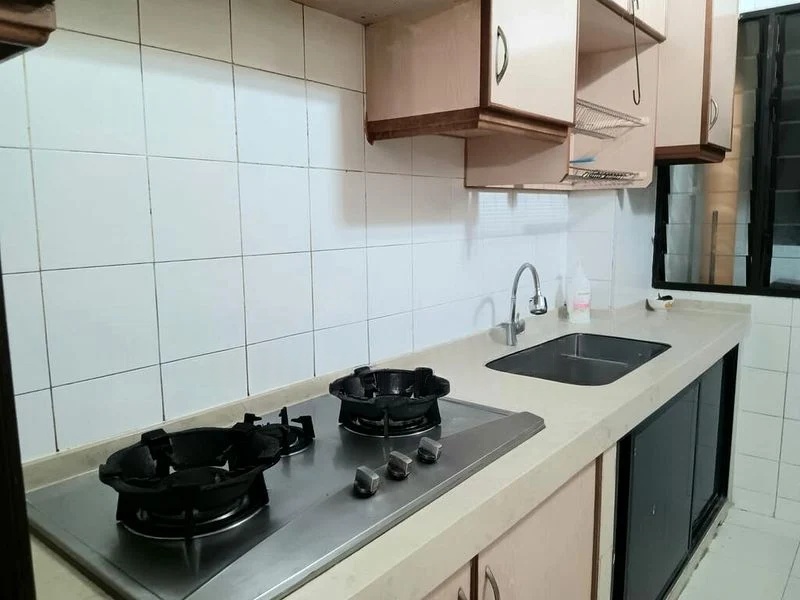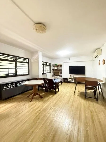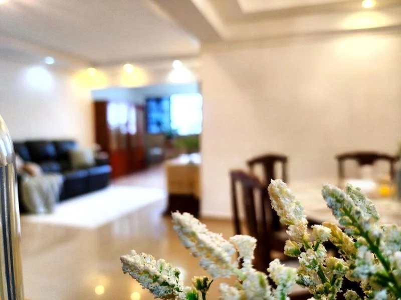 Step into this well-maintained 3-bedroom flat where natural light gently fills the living and dining area, creating a warm and inviting ambiance. The tiled flooring complements the wooden sofa set and glass-top coffee table, while the ceiling fan with integrated lighting adds a touch of modernity to the functional space.