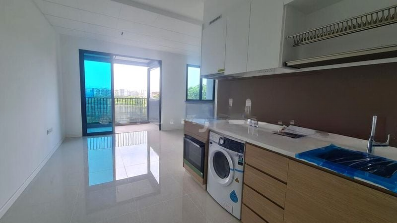 Step into a world of light and space in this brand-new 3-bedroom unit at Treasure at Tampines. The moment you enter, you are greeted by an abundance of natural light pouring through the floor-to-ceiling windows, illuminating the polished tile flooring and creating a bright, airy ambiance. The open-concept living and dining area seamlessly connects to a private balcony, offering serene views of lush greenery and the urban landscape beyond.