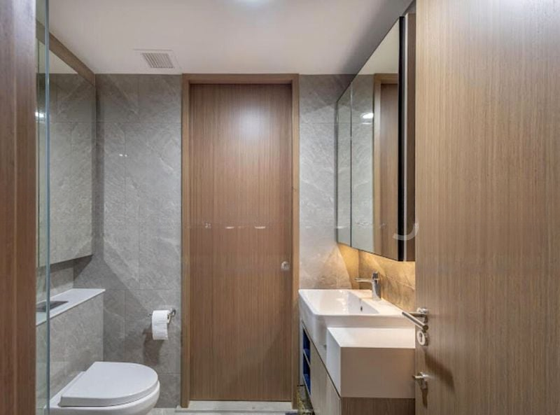 This efficient 1-bedroom plus study layout boasts standout features including a luxurious en-suite bathroom with a rain shower, an integrated kitchen with high-end appliances, and a charming balcony adorned with wooden deck tiles, perfect for outdoor dining. The built-in study nook offers an ergonomic workspace, seamlessly blending functionality with style.
