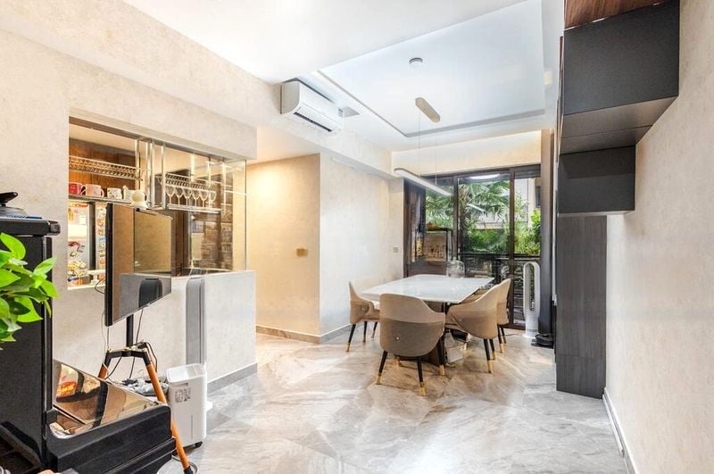 Step into a world of modern elegance as you enter this brand-new 4-bedroom unit at The Commodore. The abundant natural light floods through the floor-to-ceiling windows, highlighting the sleek finishes and expansive views of neighboring greenery. The large format marble-look floor tiles in the living and dining area create a seamless flow, while the dark wood flooring in the bedrooms adds a touch of warmth to the minimalist ambiance.