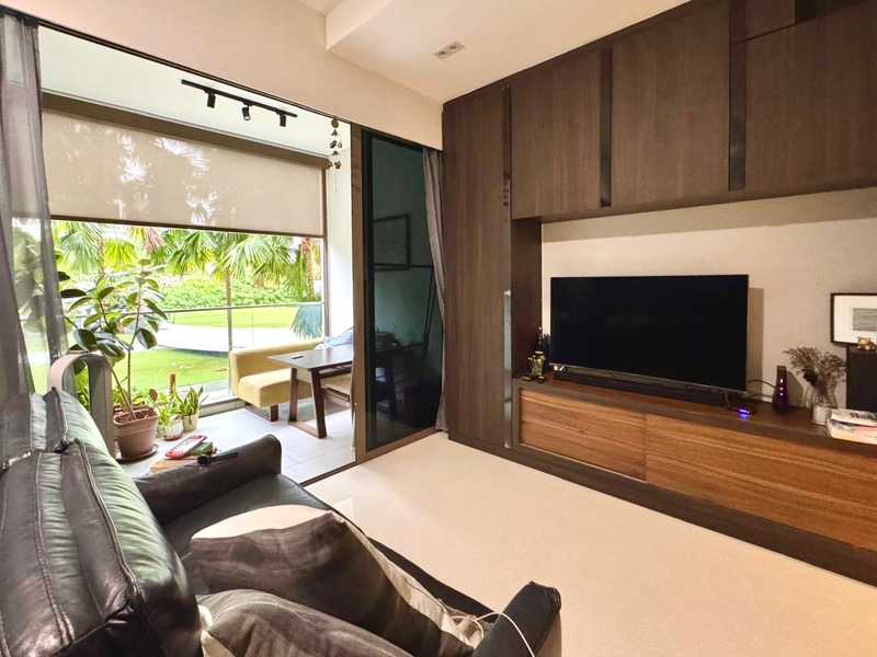 Step into a sanctuary of light and tranquility at The Inflora, where abundant natural light floods the open-plan living and dining area, accentuated by large windows that frame stunning views of the lush pool and greenery. The bright ambiance is enhanced by modern track lighting and elegant light-colored tiled flooring, creating a welcoming atmosphere that feels both spacious and inviting.