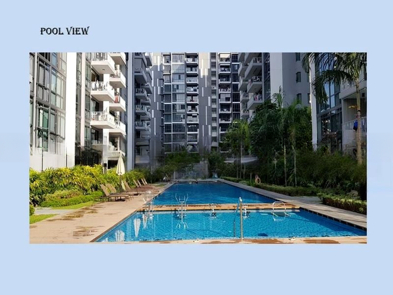 Step into a bright and airy sanctuary at The Luxurie, where abundant natural light floods through floor-to-ceiling windows, offering stunning views of the pool and city skyline. The ambiance is inviting, creating a perfect retreat for relaxation and entertainment. The spacious balcony invites you to unwind while soaking in the urban scenery.