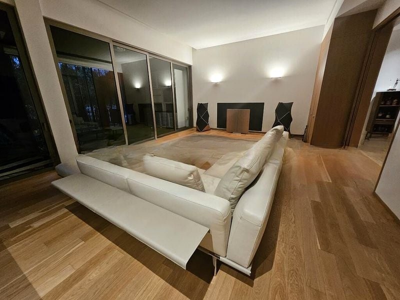 Step into a world of modern luxury as you enter this exquisite unit at Seven Palms Sentosa Cove. The ambiance is immediately captivating, with floor-to-ceiling glass sliding doors that frame stunning views of lush greenery and the shimmering pool, inviting natural light to dance across the designer finishes. The living room, adorned with a modern inset fireplace and a large white leather sofa, exudes sophistication, while the cove lighting enhances the overall warmth of the space.