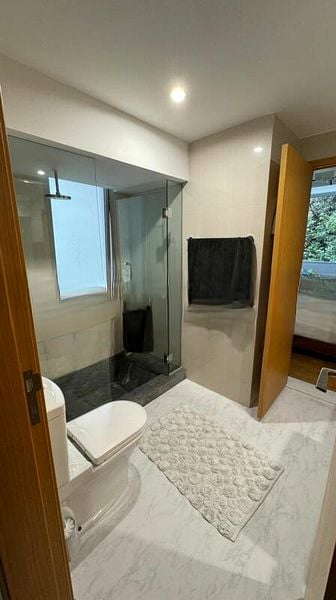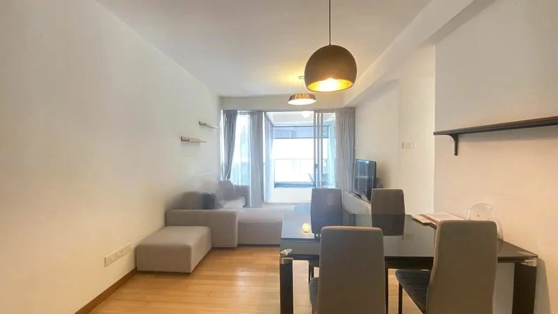 Step into a world of modern elegance at 8 @ Mount Sophia, where abundant natural light floods the open-concept living space, creating a bright and airy ambiance. The minimalist design features wood flooring throughout, complemented by large floor-to-ceiling windows that offer urban views of the surrounding neighborhood. The glass-enclosed kitchen, with its sleek light wood cabinetry and white countertops, seamlessly integrates with the dining area, making it perfect for entertaining.