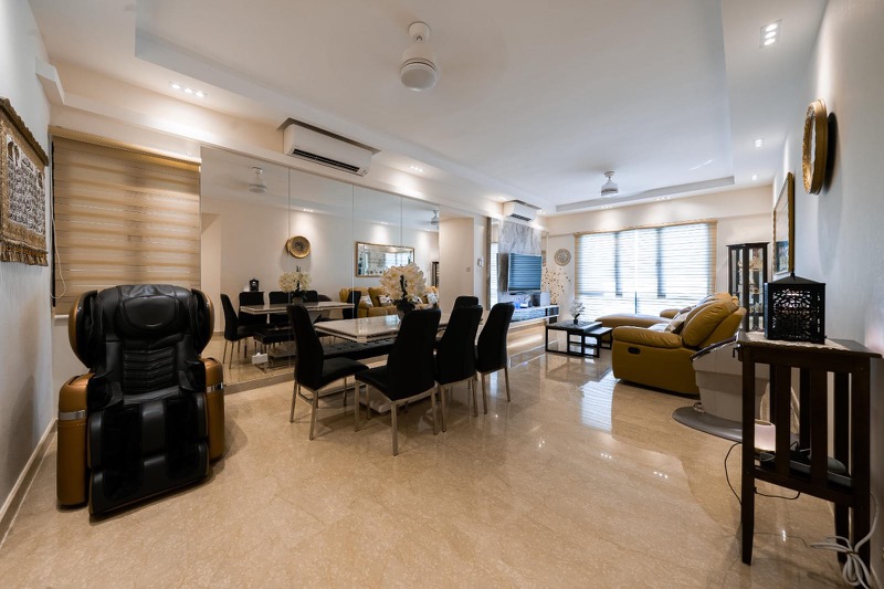 Step into a world of elegance as you enter this beautifully renovated unit at SimsVille. The polished marble-look floor tiles reflect the ambient light, creating a warm and inviting atmosphere. With a striking floor-to-ceiling mirror wall in the dining area, the space feels expansive and sophisticated, perfect for both relaxation and entertaining.