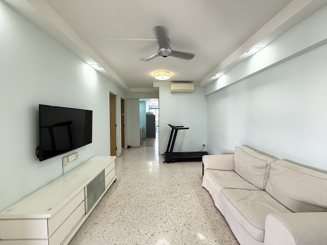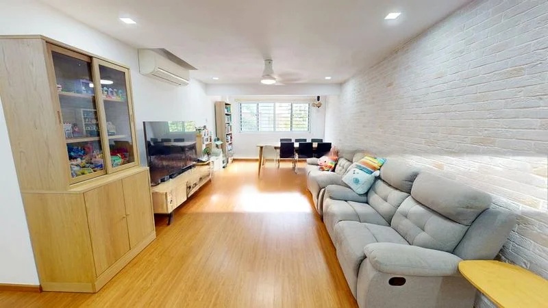 Step into a sanctuary of light and space with this beautifully renovated 4-bedroom flat in Tampines. The open-plan living room greets you with a striking white brick feature wall, complemented by abundant natural light streaming through large windows. The airy ambiance is enhanced by recessed lighting and a ceiling fan, creating a perfect setting for relaxation or entertaining.