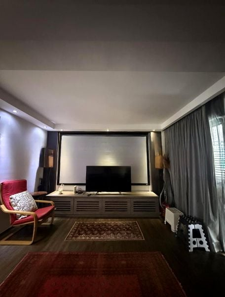 Step into a world of modern minimalism as you enter this beautifully renovated 2-bedroom flat at 77 Lor Limau. The ambiance is enhanced by recessed ceiling lights and dark wood finishes, creating a warm yet contemporary feel. Natural light filters through the windows, illuminating the spacious living area, which features a large projector screen perfect for movie nights.