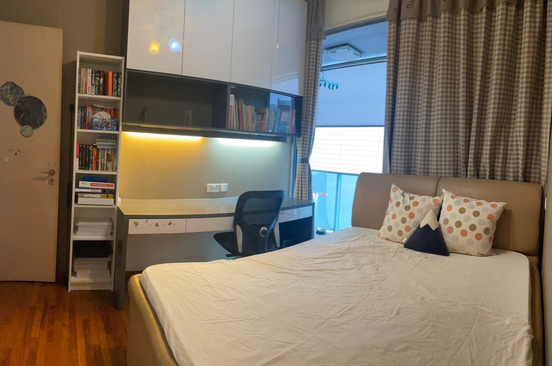 This thoughtfully designed unit boasts a built-in study desk with overhead storage, perfect for work or study. The spacious bedroom includes a floor-to-ceiling built-in wardrobe and provides direct access to a private balcony, enhancing the living experience. The modern bathroom features a stylish white vessel sink, dark grey vanity cabinets, and integrated mirror lighting, creating a functional yet elegant space.