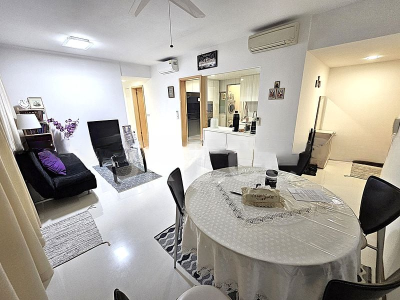 Step into a sanctuary of light and space at Kovan Residences, where the bright and airy ambiance welcomes you with open arms. The open-concept living and dining area, adorned with glossy white tiles and a ceiling fan, creates a seamless flow to the large balcony, featuring dual-finish flooring of wood decking and tiles, perfect for enjoying serene views of greenery and residential buildings.