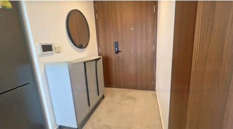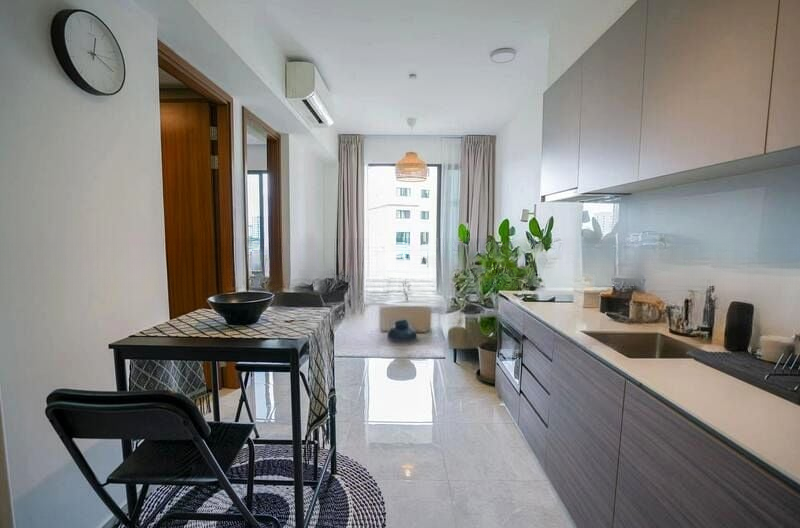 This well-maintained unit boasts a thoughtful layout that maximizes space and comfort. The living room features a striking vertical slat TV wall and mirrored panels that create an airy ambiance. The dining area, adorned with a designer pendant light and built-in storage, seamlessly connects to the stylish kitchen. The master bedroom is a true retreat, featuring a platform bed with integrated storage and a compact desk, perfect for work-from-home days.