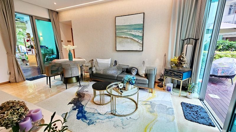 Step into a world of modern luxury as you enter this beautifully renovated unit at Caribbean at Keppel Bay. The open-concept living room greets you with a stunning marble-look feature wall, complemented by cove lighting that creates an inviting ambiance. Floor-to-ceiling windows flood the space with natural light, while the timber-decked balcony offers a serene view of lush greenery, perfect for unwinding after a long day.