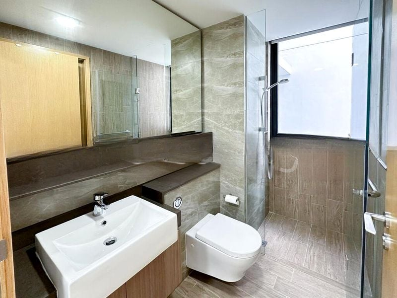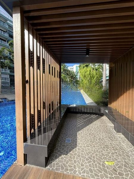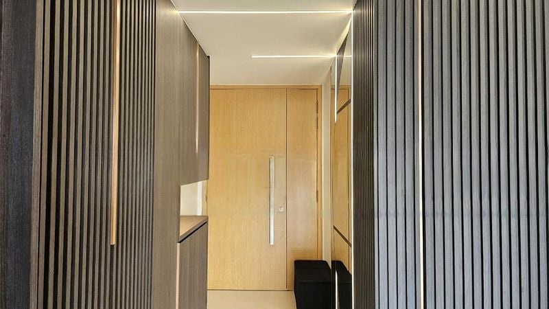 Step into a modern minimalist oasis where designer finishes meet serene views. The moment you enter this well-maintained unit at The Jovell, you are greeted by the warm ambiance created by recessed linear LED lighting and vertical wood slat feature walls. The textured grey walls and light wood doors enhance the inviting atmosphere, while moderate natural light fills the space, offering glimpses of the lush greenery and the expansive swimming pool just outside your windows.