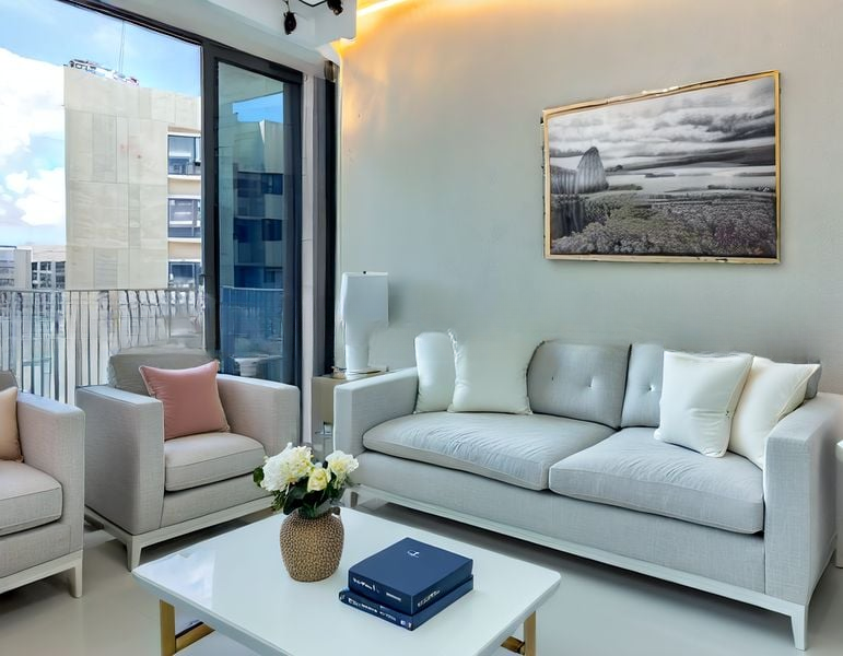 This efficient layout features a master suite with an en-suite bathroom, complemented by a blue accent wall and large windows adorned with sheer curtains. The two common bedrooms are thoughtfully designed for comfort, while the bathrooms boast contemporary finishes, including a glass shower screen and mirrored cabinets. With its fully-furnished status, this unit is ready for you to move in and make it your own.